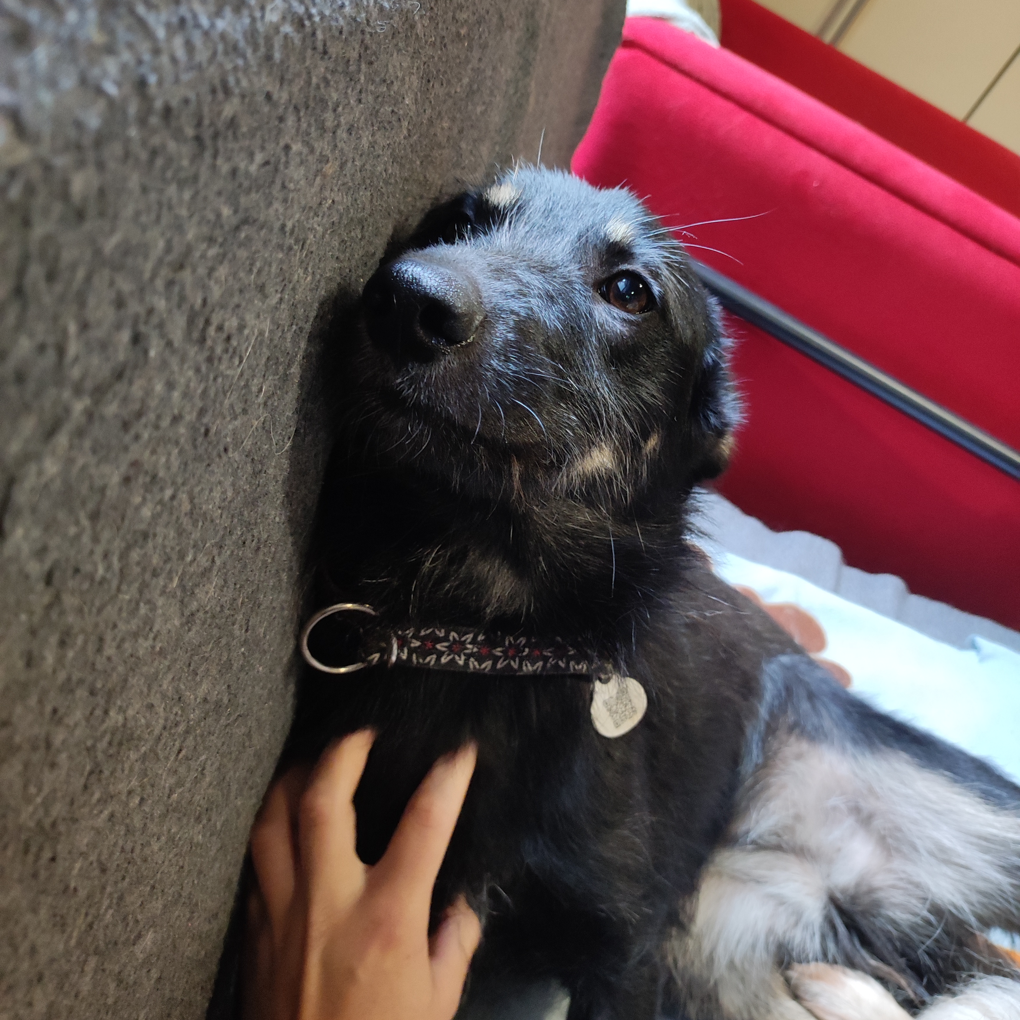 Nie ma żadnego problemu z innymi psami, czy kotami. Uwielbia koty i spędzanie z nimi czasu w kociarni, z radością zapoznanie się z innymi psami i zaczepia je do zabawy.
