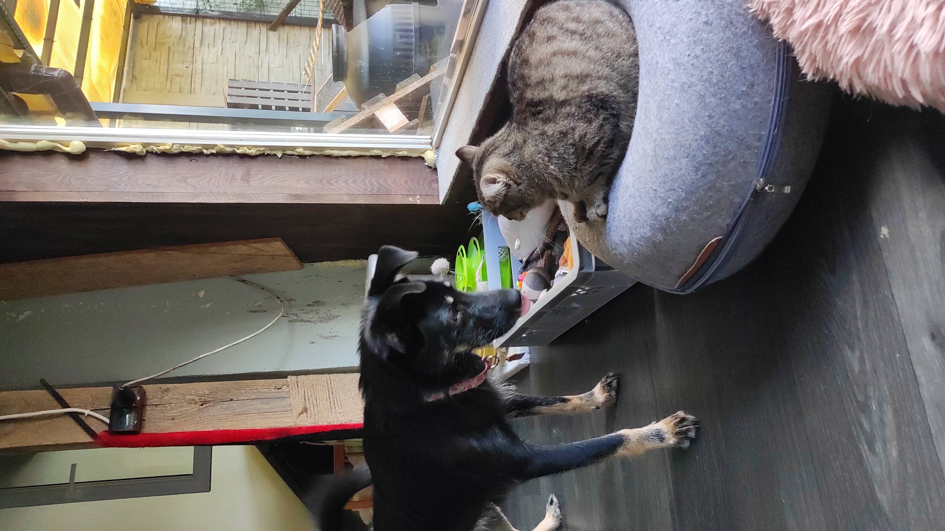 Nie ma żadnego problemu z innymi psami, czy kotami. Uwielbia koty i spędzanie z nimi czasu w kociarni, z radością zapoznanie się z innymi psami i zaczepia je do zabawy.